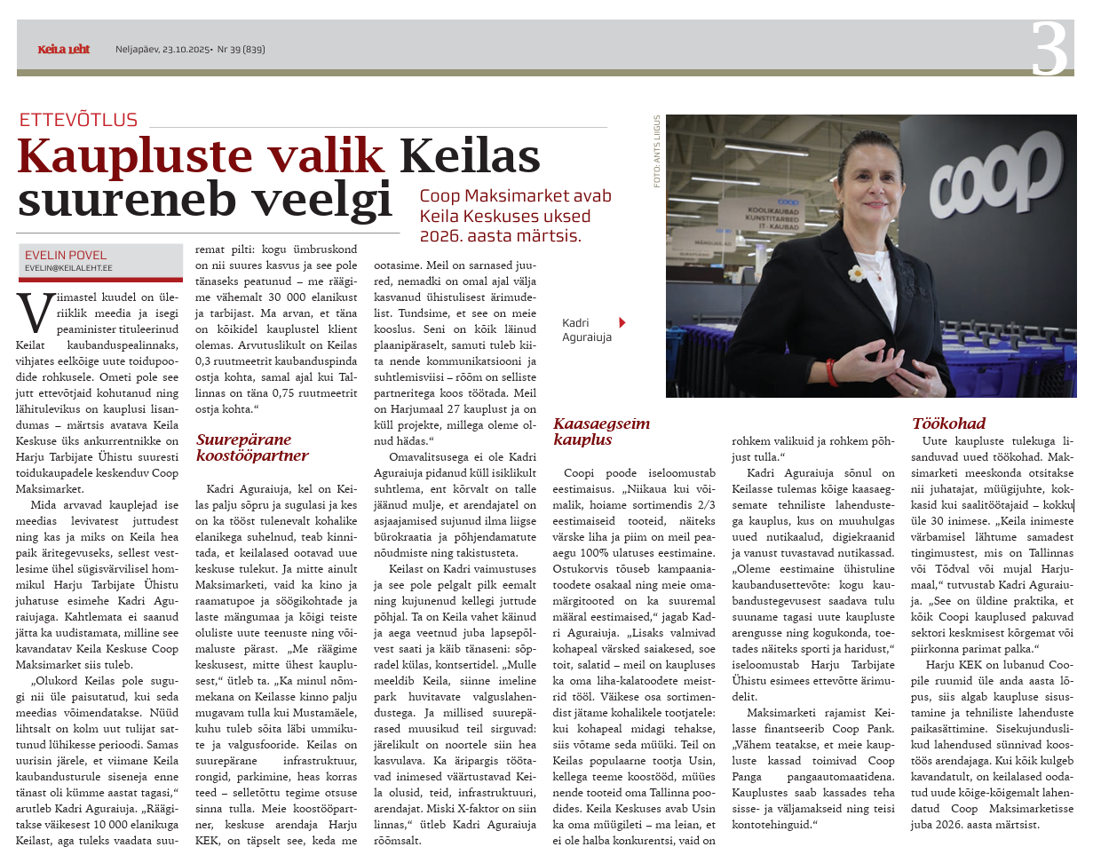 Mida arvavad kauplejad ise meedias levivatest juttudest ning kas ja miks on Keila hea paik äritegevuseks, sellest vestlesime ühel sügisvärvilisel hommikul Harju Tarbijate Ühistu juhatuse esimehe Kadri Aguraiujaga. Kahtlemata ei saanud jätta ka uudistamata, milline see kavandatav Keila Keskuse Coop Maksimarket siis tuleb.