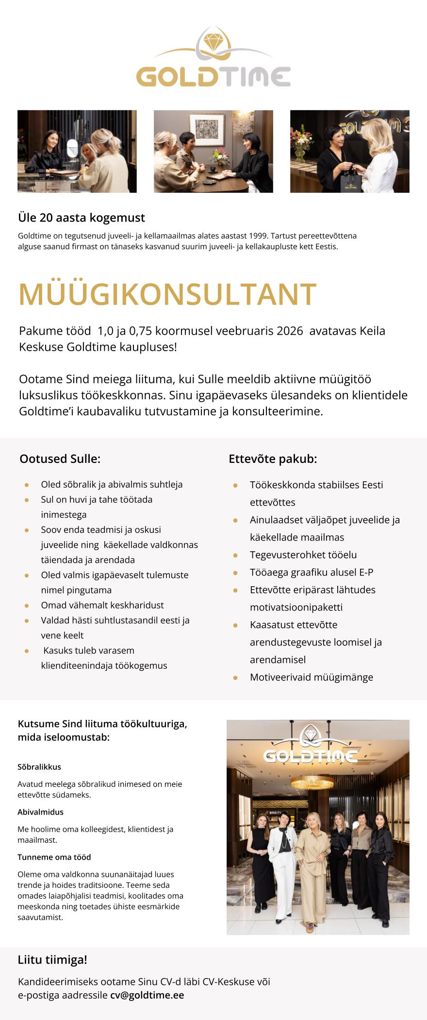 Keila keskuse tiimi ootame inimest, kellele meeldib aktiivne müügitöö ning kellele pakub rõõmu klientide inspireerimine ja unistuste täitmine läbi Goldtime’i kaubavaliku tutvustamise.