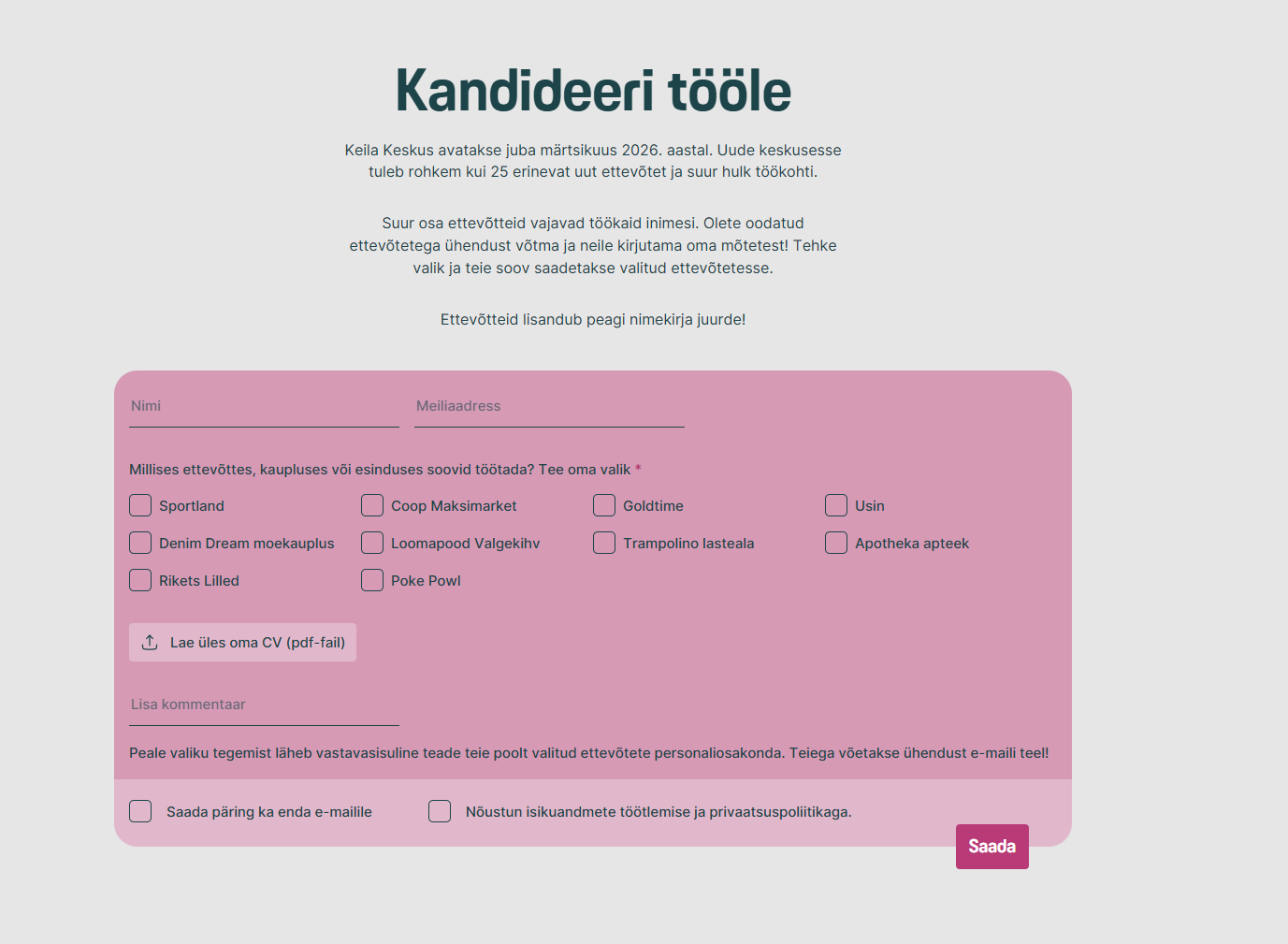 Suur osa ettevõtteid vajavad töökaid inimesi. Olete oodatud ettevõtetega ühendust võtma ja neile kirjutama oma mõtetest! Külastage Keila Keskuse kodulehte https://keilakeskus.ee/kandideeri-toole/ ja tehke valik ning teie soov saadetakse valitud ettevõtetesse.